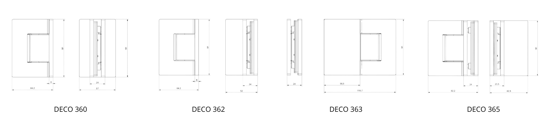 DECO es la colección de bisagras de alineación regulable, que bajo la base de la bisagra BAR se ha mejorado el acabado exterior, con tapas embellecedoras incluida la base pared, quedando la tornillería totalmente oculta en toda la bisagra. Líneas rectas e impecable diseño define la bisagra DECO, con la posibilidad de acabados en cromo brillo, níquel satinado y cromo negro mate.