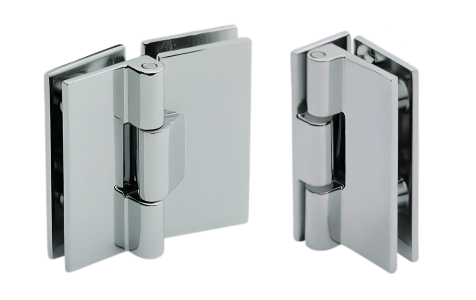 Consisting of pivot points, hinges, and glass panel connectors, with internal adjustment mechanisms that facilitate installation and precise alignment of the glass doors.