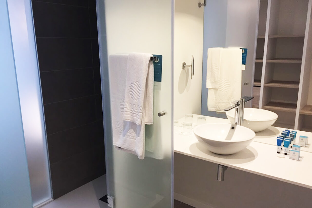 Un complejo hotelero con habitaciones equipadas con herrajes Trivel en las mamparas de baños.