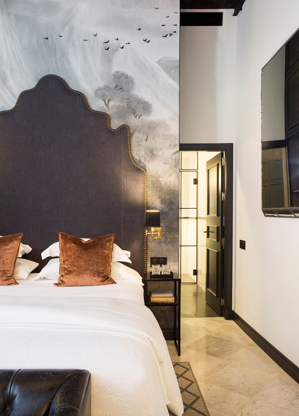 Bisagras Hidrobi en negro mate, que integran las puertas enmarcadas y mamparas de los baños de este magnífico palacete reconvertido en un exclusivo hotel Boutique, en el centro de Cádiz.