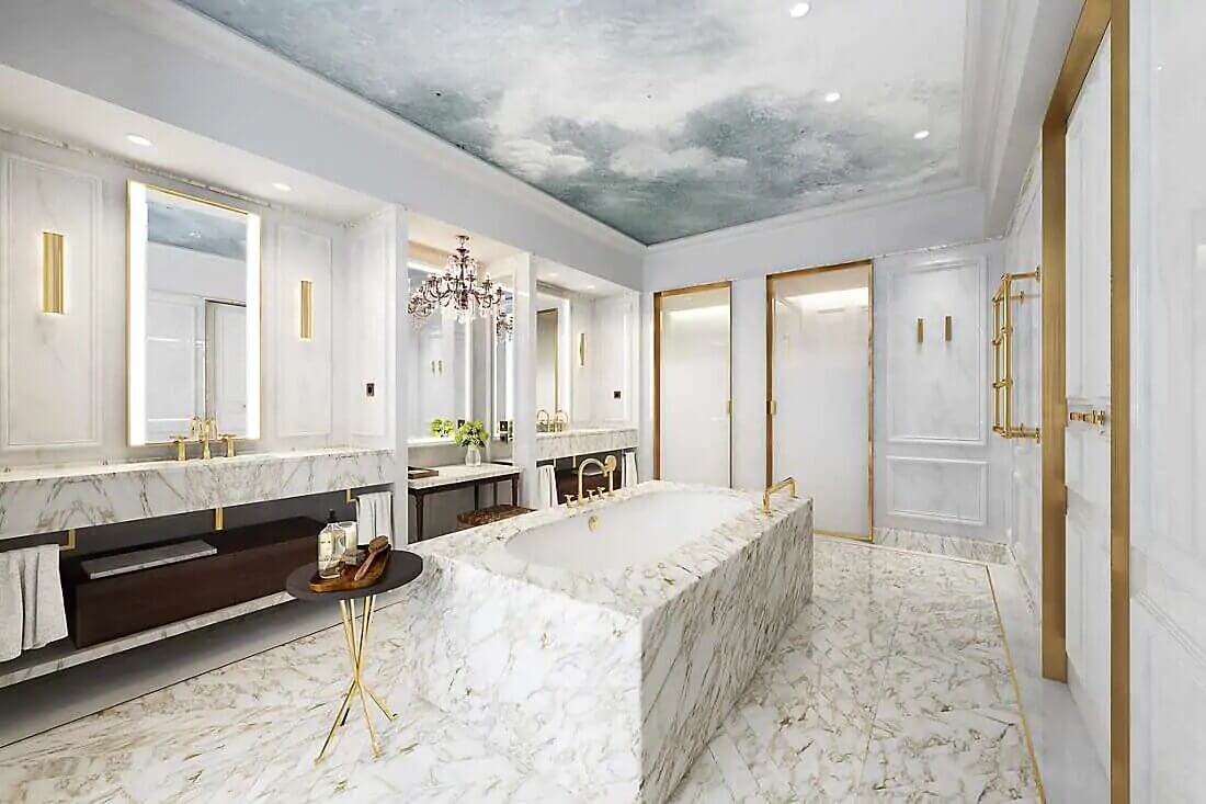 Trivel ha diseñado la perfilería del mecanismo interior de las mamparas y separaciones de los baños de las habitaciones y suites para integrar los herrajes en madera y en color oro.