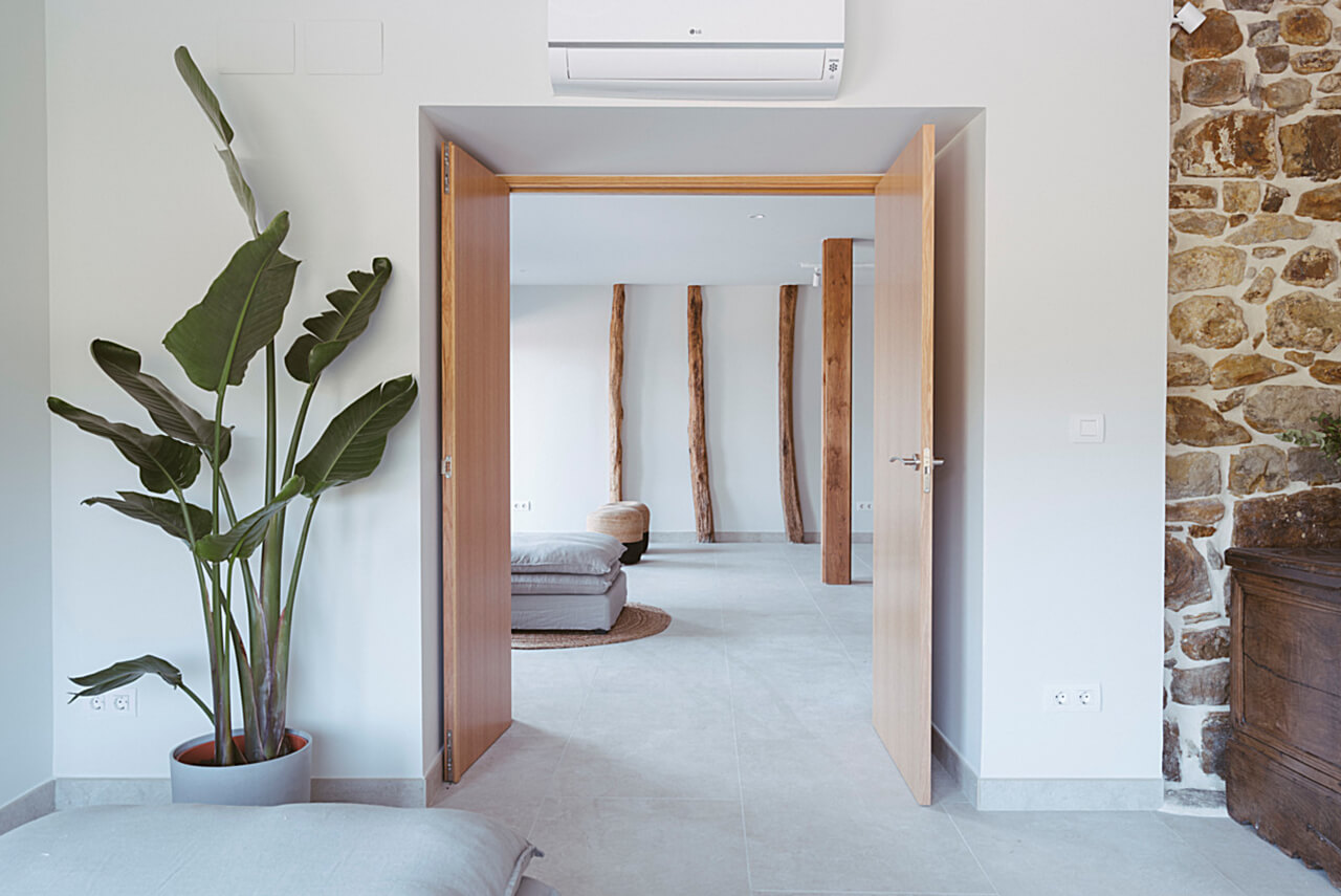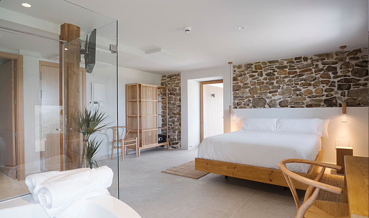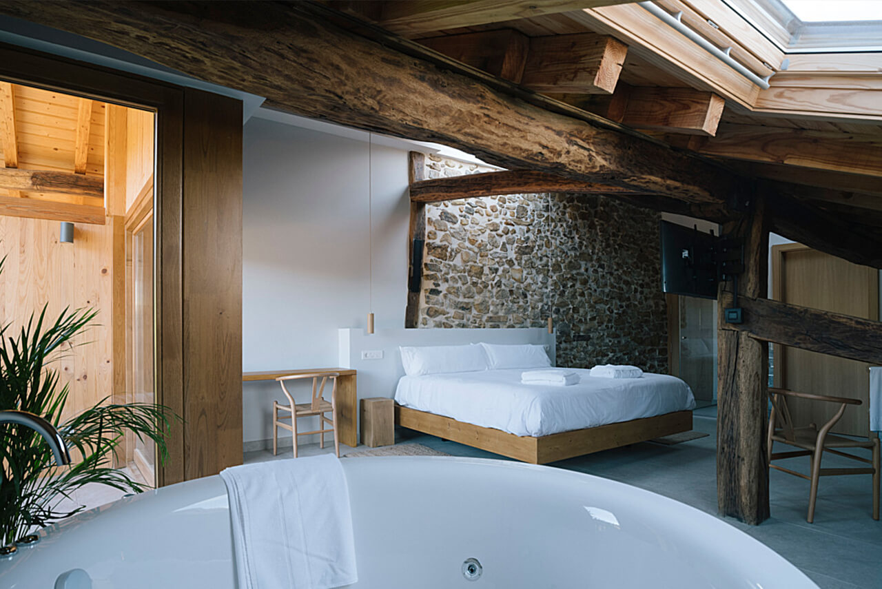 El hotel Nafarrola, un histórico caserío vasco de 1.285 que ha sido restaurando cuidado la esencia original, con magníficas y modernas habitaciones con baños abiertos separados con mamparas y vidrios.