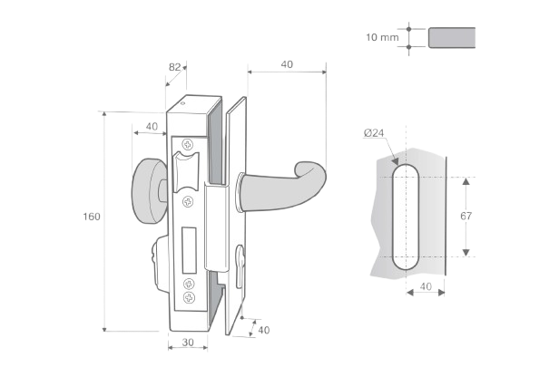 Picaporte reversible y accionado por llave, salida picaporte 10m/m