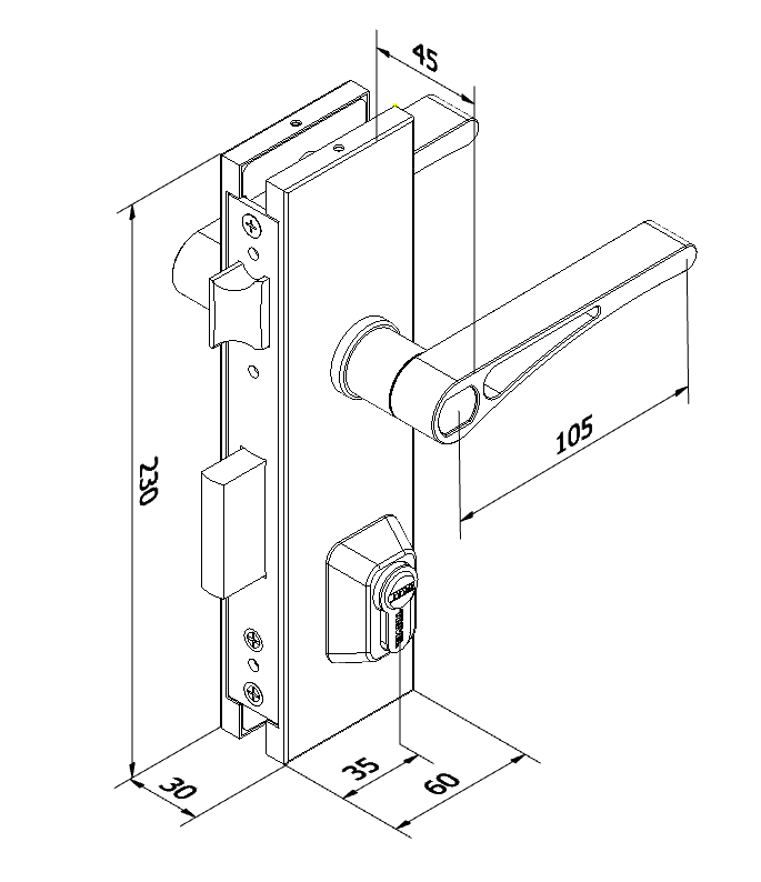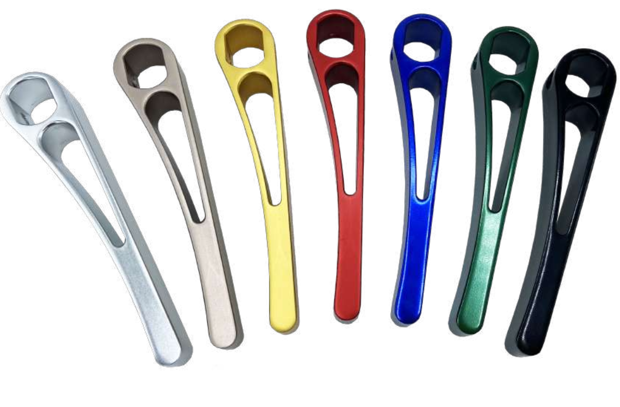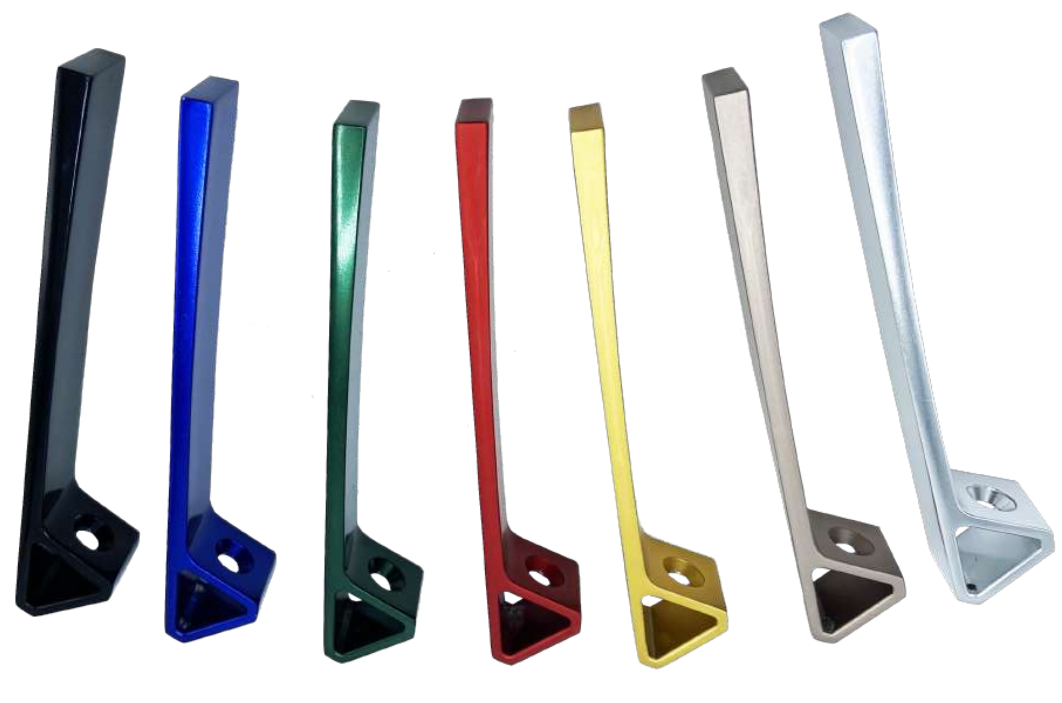 Manillas fabricadas en aleación de aluminio extrusionado y acabado anodizado en varios colores, reversible e intercambiable, gracias al diseño del adaptador entre manilla y cerradura fabricado en acero inoxidable.